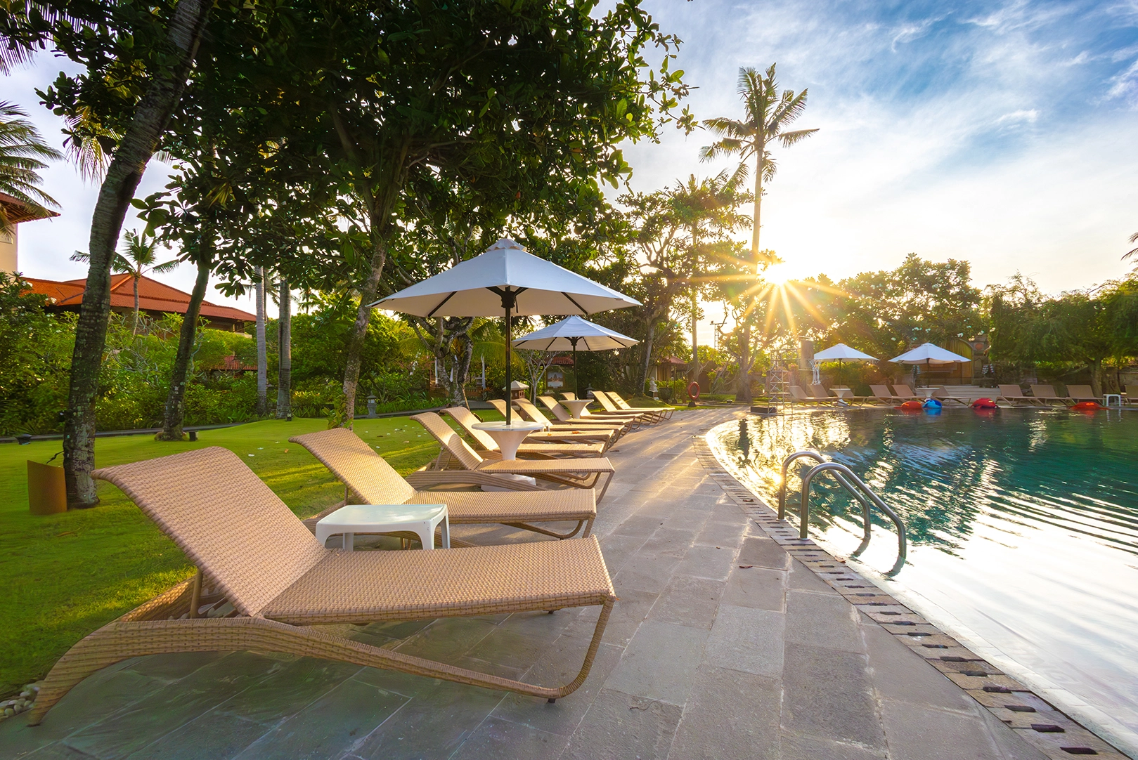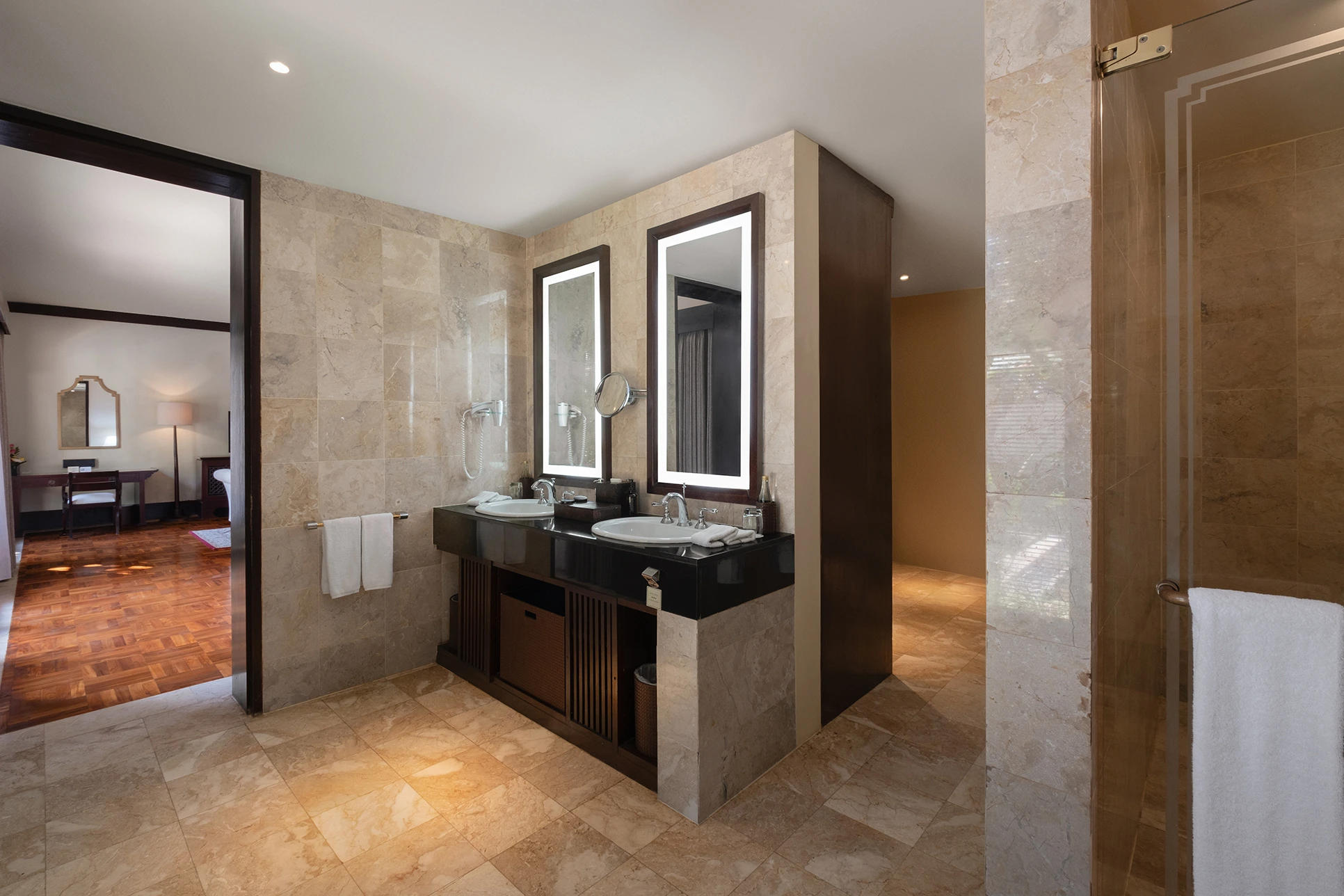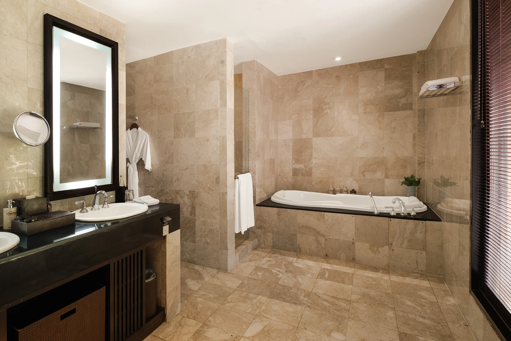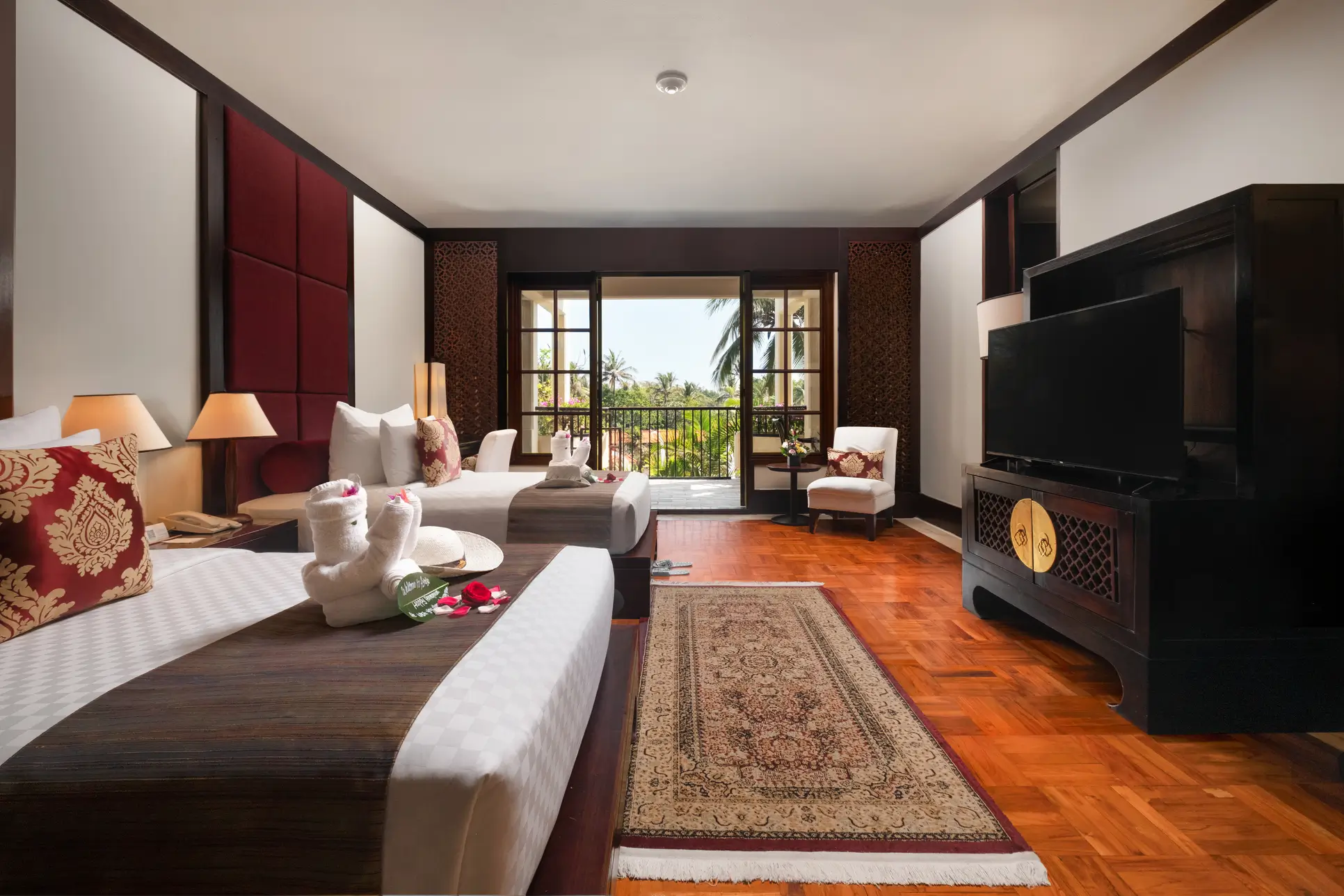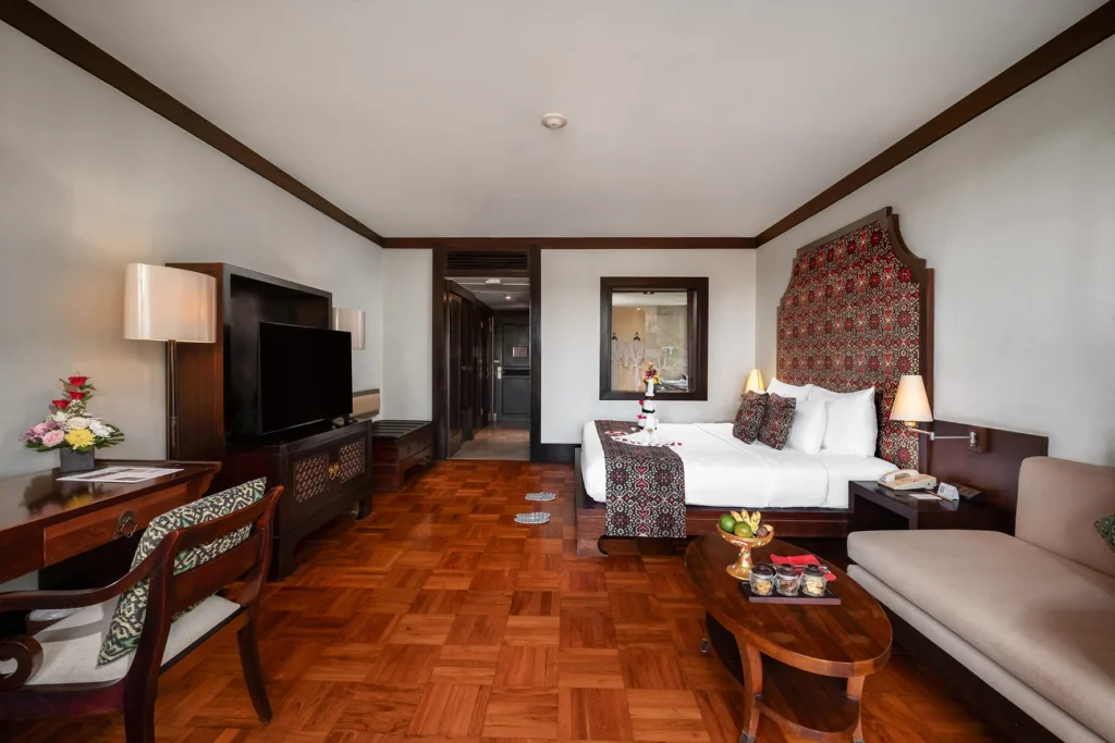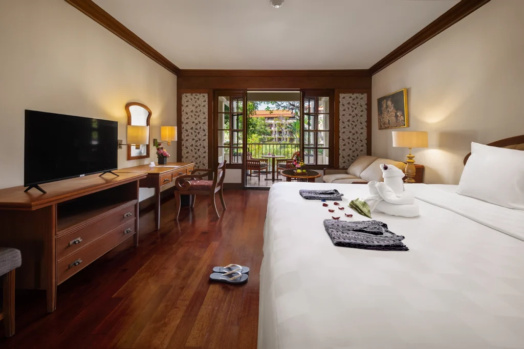 ارتقِ بتجربة إقامتك الترفيهية أو رحلة العمل إلى مستوى أعلى في هذه الغرفة الراقية التي توفّر إطلالات رائعة من الشرفة الخاصة على الحدائق الاستوائية المصمّمة بعناية، أو المسبح، أو بحيرة المنتجع الهادئة. تمتد الغرفة على مساحة سخية تبلغ 56 مترًا مربعًا، لتمنحك لحظات من السكينة والاسترخاء التام. يتميّز ديكور غرفة كلاسيك غراند بأناقة استثنائية تشمل أرضيات من خشب الساج المصقول، وأثاثًا مصنوعًا بعناية من خشب الساج، ولمسات من الزخارف البالينية التقليدية التي تعكس روح المكان. يمكنك الاسترخاء على الأريكة المريحة، والاستمتاع بفنجان قهوة ساخن يُقدَّم إلى غرفتك، ومشاهدة برامجك المفضلة على التلفزيون بشاشة مسطّحة، مع البقاء على اتصال عبر خدمة الواي فاي المجانية. تتوفر هذه الفئة بخيار سرير كينج أو سريرين منفصلين لتناسب مختلف تفضيلات الضيوف.