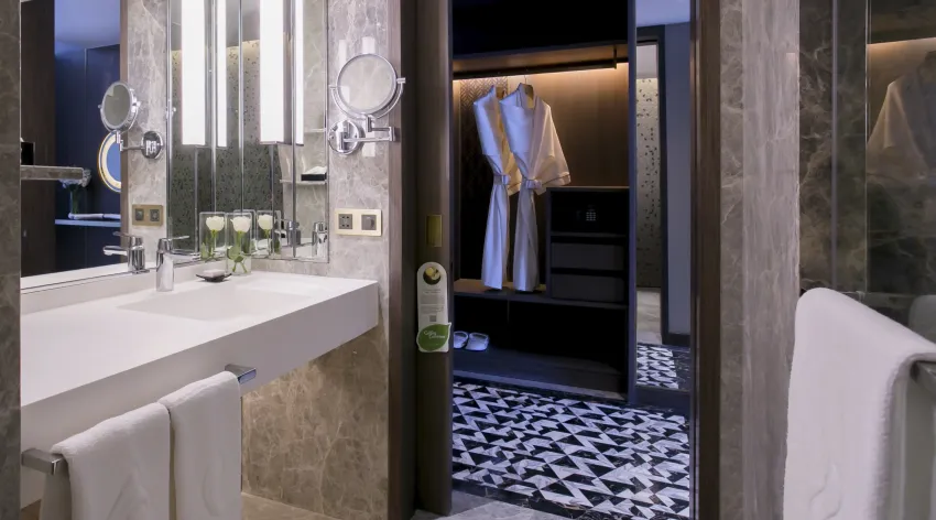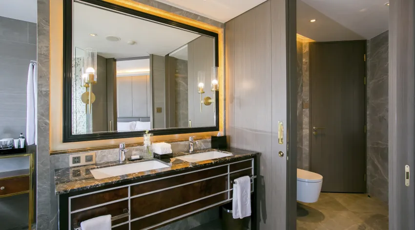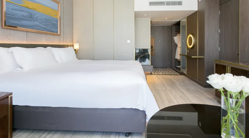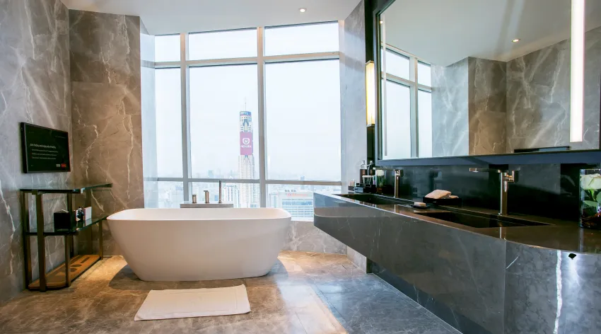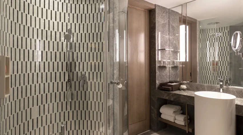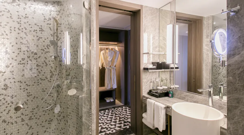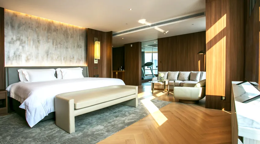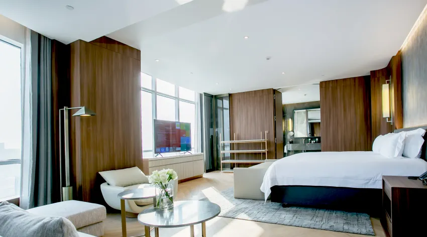 ادعُ عائلتك وأصدقاءك للاستمتاع بإقامة مميزة في جناح إكزكيوتيف سويت. يضم الجناح غرفة معيشة فسيحة ومشرقة تتيح لك استقبال الضيوف والاسترخاء في أجواء راقية ومريحة. يتميز التصميم الداخلي بلمسات من الخشب الفاتح ولوحة ألوان أنيقة بدرجات الرمادي العصري، مما يجعل من المساحة البالغة 110 أمتار مربعة ملاذًا حضريًا راقيًا. ابدأ يومك بالاسترخاء في حوض الاستحمام الفاخر، وأنهِه بهدوء بينما تتأمل أفق المدينة الساحر.