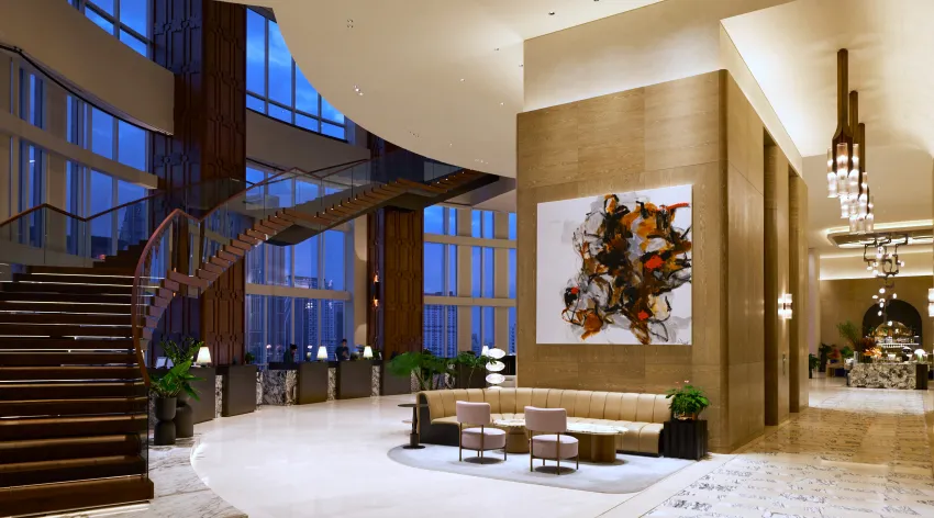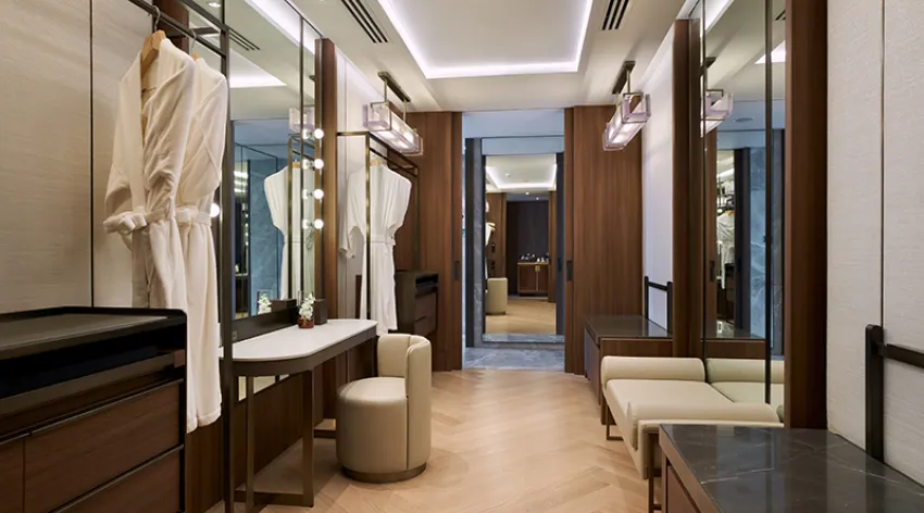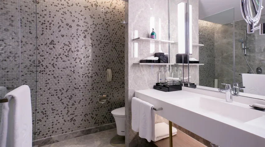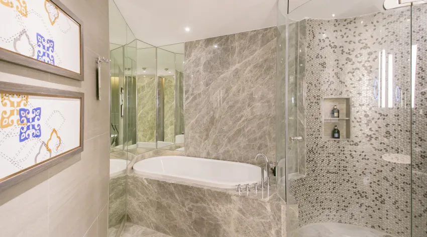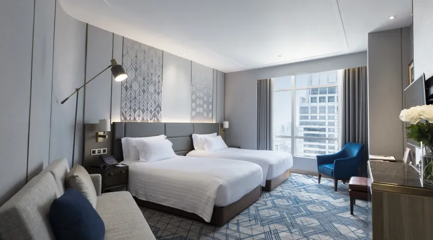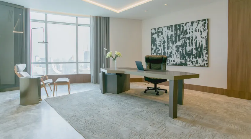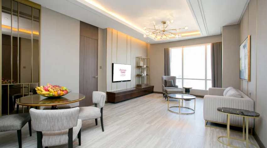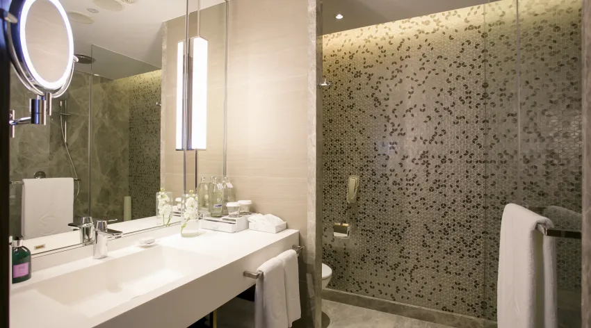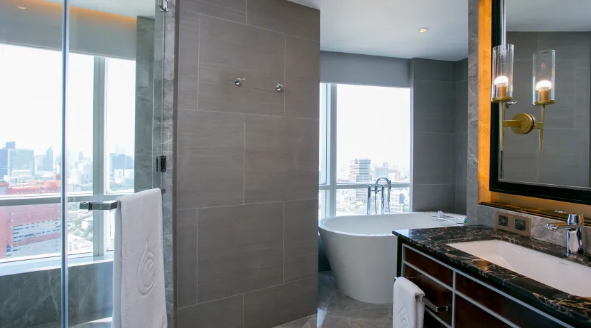 ادعُ عائلتك وأصدقاءك للاستمتاع بإقامة مميزة في جناح إكزكيوتيف سويت. يضم الجناح غرفة معيشة فسيحة ومشرقة تتيح لك استقبال الضيوف والاسترخاء في أجواء راقية ومريحة. يتميز التصميم الداخلي بلمسات من الخشب الفاتح ولوحة ألوان أنيقة بدرجات الرمادي العصري، مما يجعل من المساحة البالغة 110 أمتار مربعة ملاذًا حضريًا راقيًا. ابدأ يومك بالاسترخاء في حوض الاستحمام الفاخر، وأنهِه بهدوء بينما تتأمل أفق المدينة الساحر.