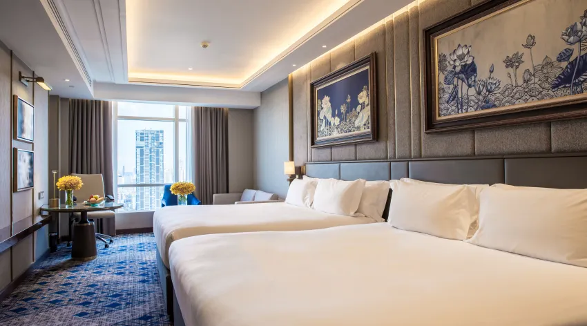 تم تصميم غرفة ديلوكس بعناية لتوفير أقصى درجات الراحة، حيث تتميز بديكور أنيق بألوان كريمية هادئة تتخللها لمسات من اللون الأرجواني الملكي. تمتد النوافذ من الأرض إلى السقف لتمنحك إطلالات خلابة على أفق بانكوك. تمتد مساحة الغرفة إلى 36 مترًا مربعًا وتضم سريرًا فخمًا بحجم كينغ، ويمكنك أن تبدأ يومك بالاسترخاء في حمامك الفاخر.
