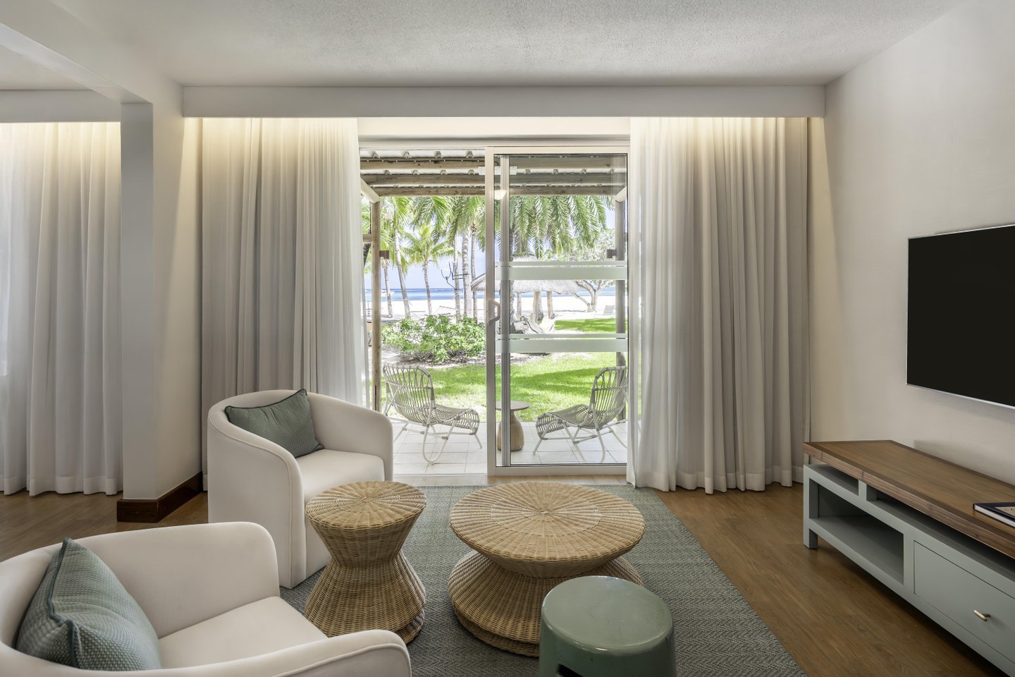 منذ لحظة دخول هذا الجناح، يستقبل الضيوف بمشهد أخّاذ للشاطئ والبحيرة المتلألئة التي تزين إطلالاتهم كل صباح. ومع تدفق ضوء الشمس إلى الغرفة، تعكس الأسقف العالية والألوان الناعمة إحساسًا أوسع بالمساحة. يضفي الأثاث الخشبي الأنيق مع التفاصيل ذات الدرجات الترابية الغنية لمسة راقية على الأجواء. تفتح غرفة النوم الواسعة على شرفة مريحة، مثالية للأزواج للاستمتاع بلحظات غروب شمس لا تُنسى. يجمع هذا الجناح بين الفخامة والسحر الاستوائي، ليمنح الأزواج كل ما يحتاجونه لقضاء عطلة مثالية.