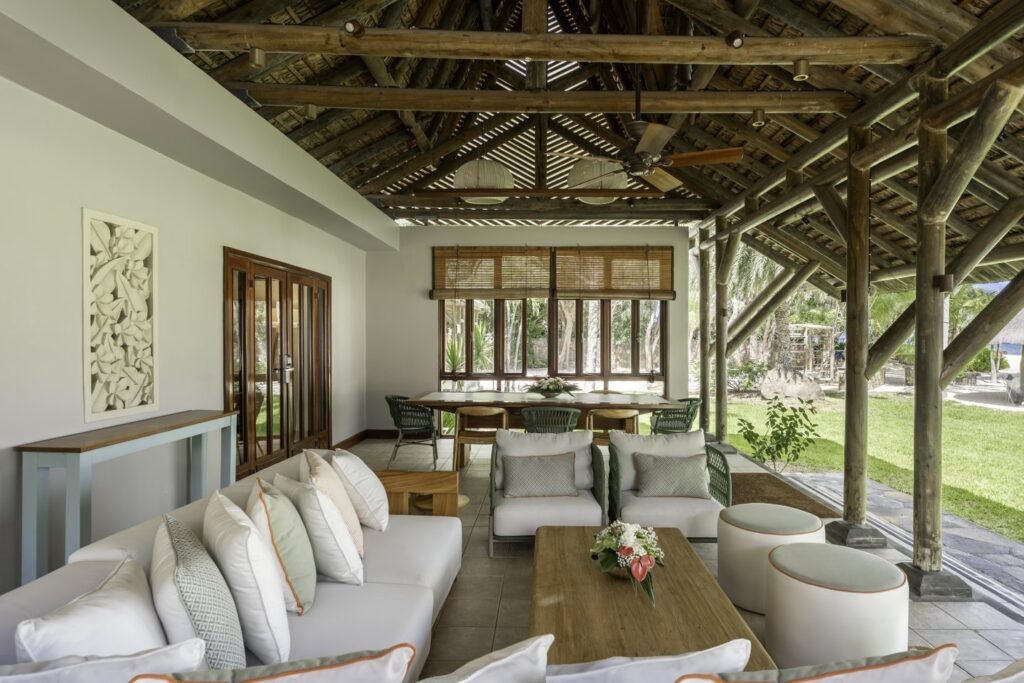 تنتشر أشجار النخيل المتمايلة في أرجاء التراس الخارجي الفسيح المكسو بأرضيات خشبية طبيعية، والممتد بمحاذاة مياه المسبح المتلألئة. كما تنتشر الطاولات في الداخل قرب منطقة البوفيه، وفي غرفة طعام مغلقة تذكّر بشرفات موريشيوس الاستعمارية مع نوافذ واسعة تُفتح على واحد من أجمل شواطئ الجزيرة.