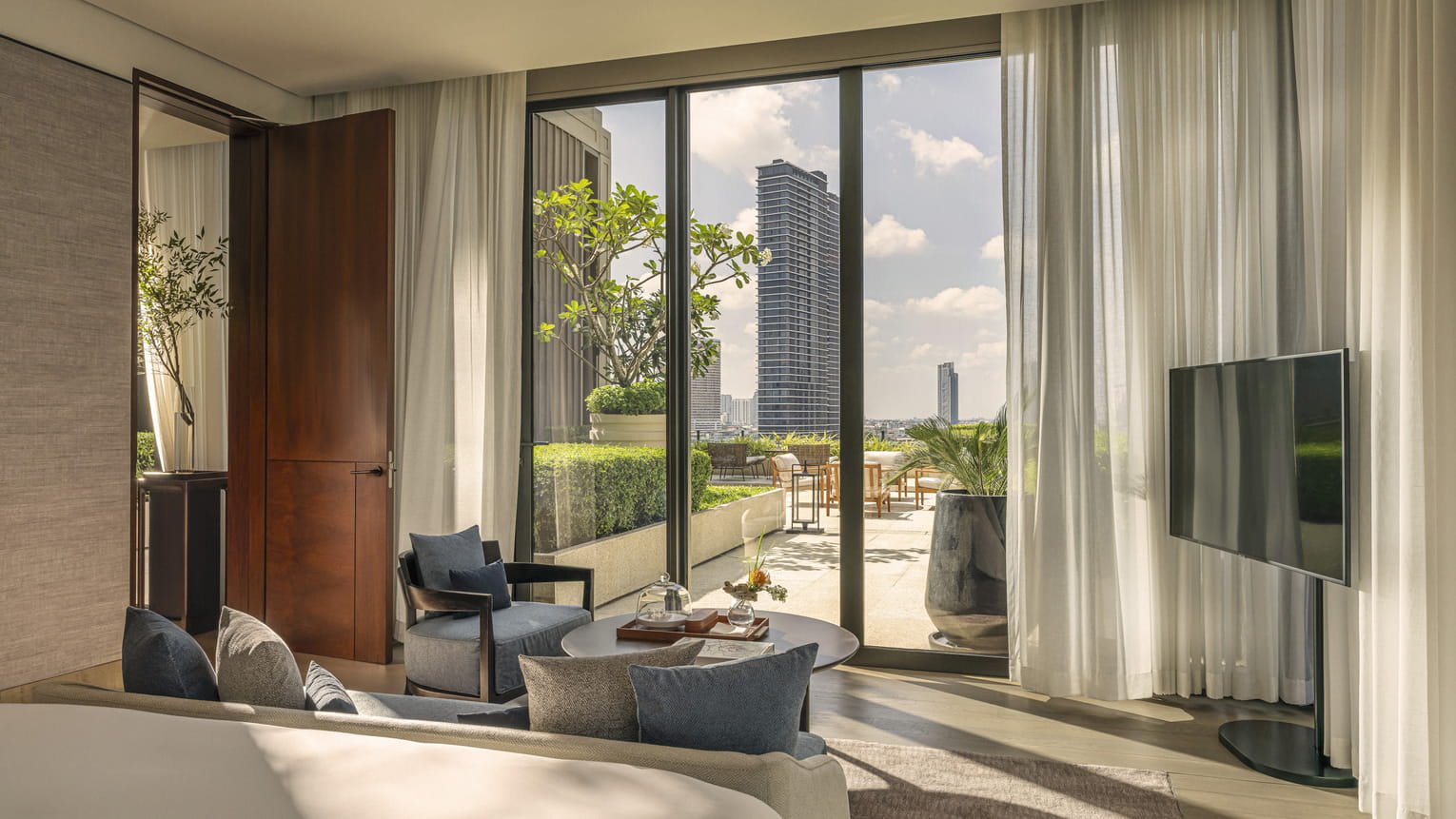 يوفّر هذا الجناح الحصري تجربة معيشة متكاملة تمزج بين المساحات الداخلية الرحبة والمساحات الخارجية على تراس السطح الكبير. استمتعوا بإطلالات مذهلة على نهر تشاو فرايا أثناء تناول الطعام أو استقبال الضيوف أو الاسترخاء على التراس الخاص. يُعد هذا الجناح الخيار المثالي للعائلات الكبيرة أو الأزواج المسافرين معًا بفضل مساحته الواسعة وتجربته الفاخرة.