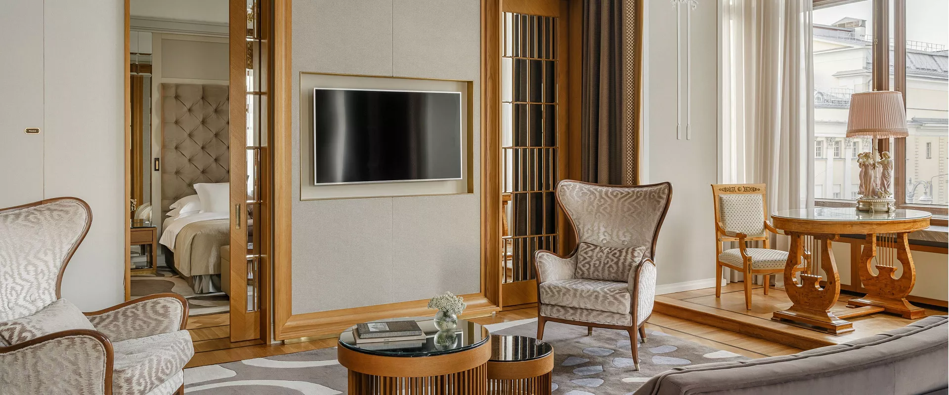 يُجسّد جناح السفير الأناقة وذروة مستويات الضيافة الرفيعة. من نوافذه يمكن للضيوف التمتع بإطلالة ساحرة على مركز موسكو التاريخي، بينما ينقل الديكور الداخلي المزدان بالأثاث العتيق، والثريات الكريستالية، والأعمال الفنية الضيوف إلى عصر خاص ومميز. يضم الجناح ثلاث غرف فاخرة: غرفة نوم مزودة بسرير كينج، وغرفة معيشة واسعة مع منطقة لتناول الطعام، ومكتب للعمل أو الاسترخاء. تضمن أحدث التقنيات، بما في ذلك نظام "المنزل الذكي"، راحة لا مثيل لها. ويكتمل الجو الراقي بإتاحة ميني بار مع ثلاجة للنبيذ وطقم شاي من البورسلان الإمبراطوري.