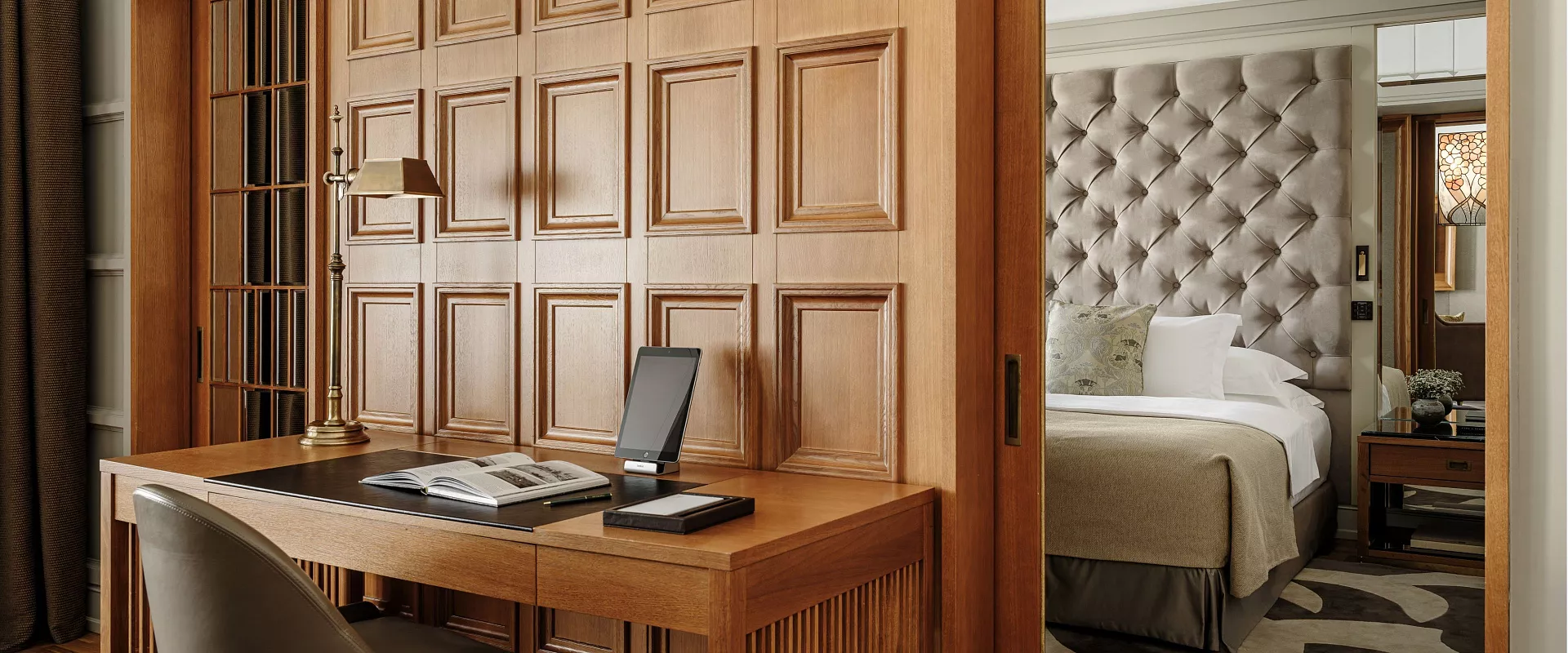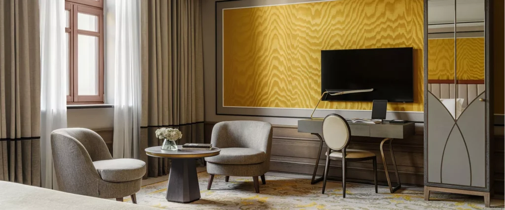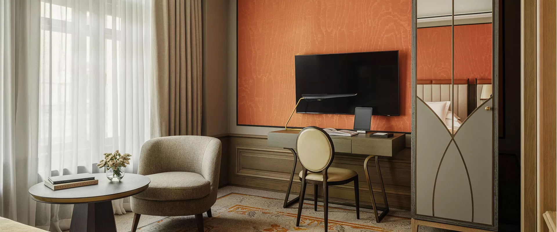 تجمع غرفة سينيشر ديلوكس بين التصميم الأنيق والمساحات الواسعة والراحة العصرية. تمنحك لوحة الألوان الفاتحة مع التفاصيل الكلاسيكية والإضاءة الناعمة أجواء من الهدوء والفخامة. تضم الغرفة منطقة عمل مجهزة بمكتب مريح ومنطقة جلوس بأثاث راقٍ تتيح لك عقد الاجتماعات أو الاسترخاء بأناقة. كما توفر النوافذ الكبيرة إطلالة خلابة على قلب موسكو النابض بالحياة. بفضل التقنيات الذكية والخدمة الراقية، ستستمتع بإقامة مفعمة بالراحة والرقي.