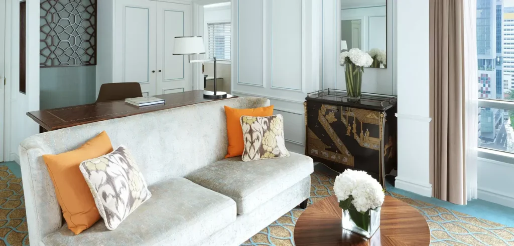يتميّز جناح جونيور بمساحته الواسعة وغمره بالضوء الطبيعي، مع تصميم داخلي أنيق بألوان الأزرق الفاتح والذهبي والأبيض. يضم الجناح غرفة معيشة منفصلة بوضوح توفر خصوصية إضافية ومساحة مثالية للاسترخاء أو العمل، مما يجعله خيارًا راقيًا لإقامة مريحة وهادئة.