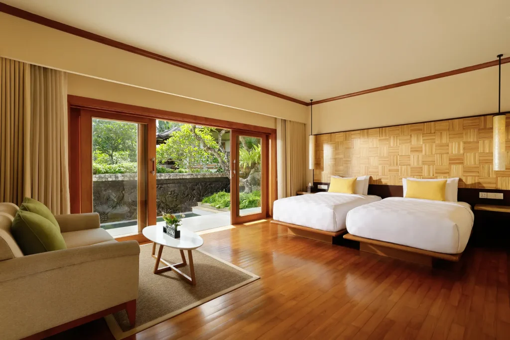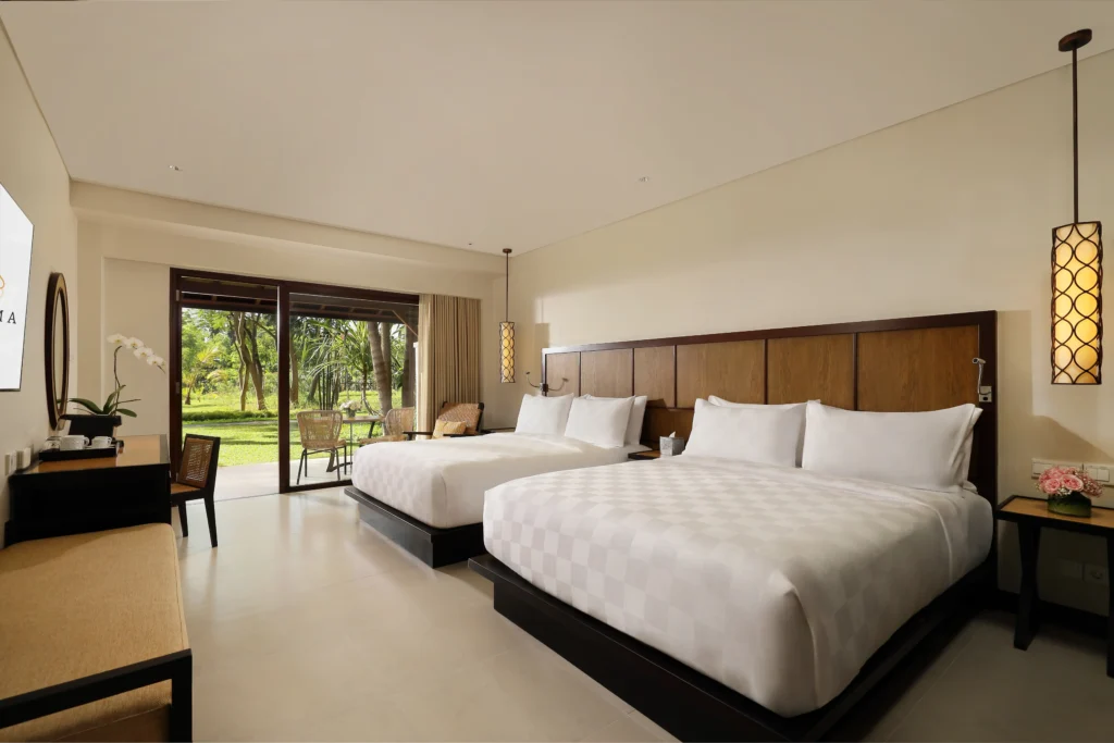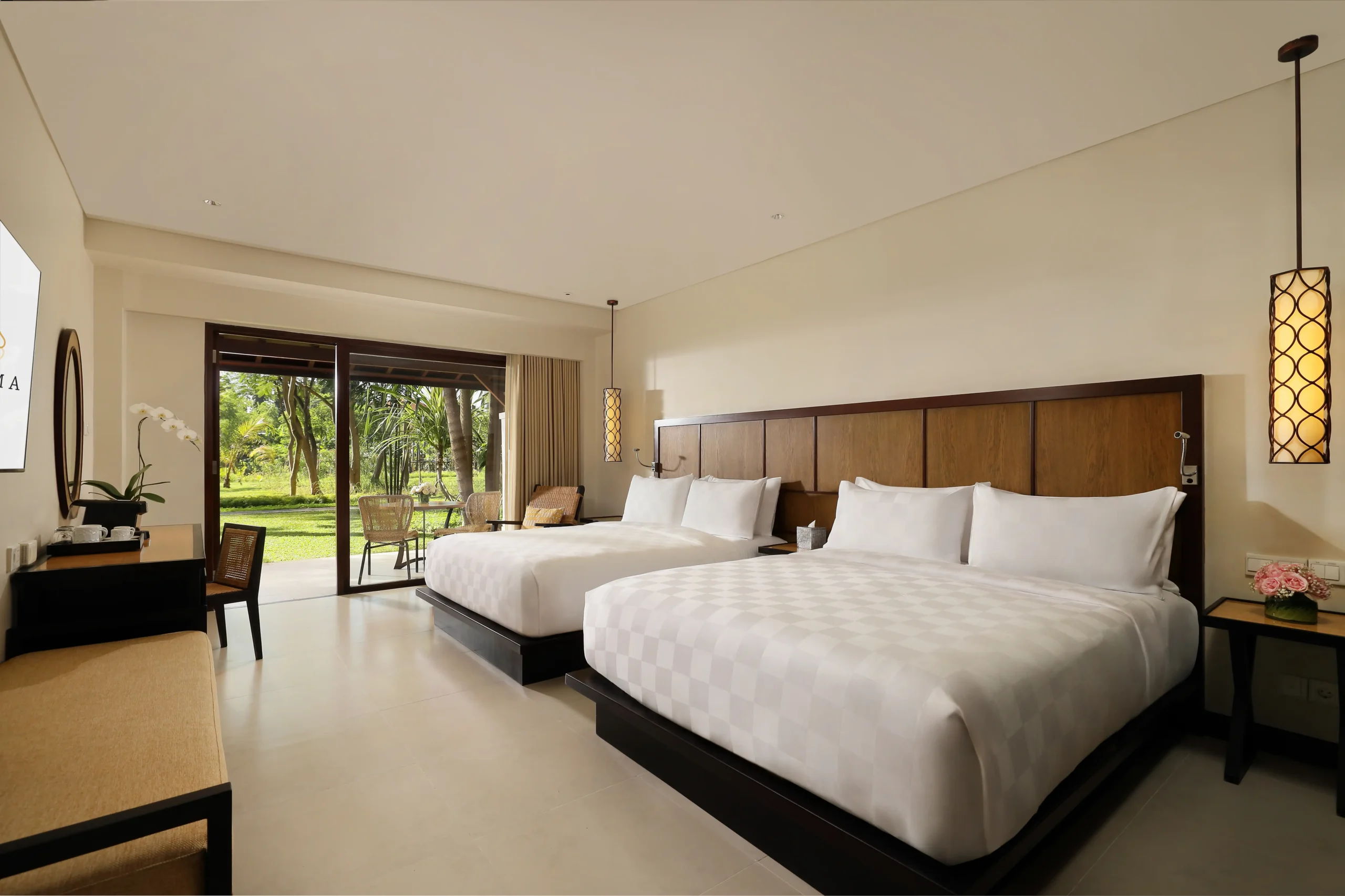 تقدّم غرفة الديلوكس العائلية تجربة إقامة واسعة وأنيقة مستوحاة من الطابع الباليني، مع شرفة خاصة تطل على الحدائق الغنية بالأعمال الفنية، ما يوفّر أجواءً هادئة ومناسبة للعائلات. تمتد الغرفة على مساحة رحبة تبلغ 76 مترًا مربعًا، وهي مكوّنة من غرفتي ديلوكس متصلتين لتمنح العائلة مساحة إضافية وخصوصية أكبر. تضم الغرفة الأولى سرير كينج فاخر، بينما تحتوي الغرفة الثانية على سريرين منفصلين، وتشتمل كلتا الغرفتين على حمّامات فاخرة مجهّزة بدش وحوض استحمام مستقل. وتُعد هذه الفئة الخيار المثالي للعائلات الباحثة عن الراحة، والرحابة، وتجربة إقامة راقية تناسب جميع أفراد الأسرة.