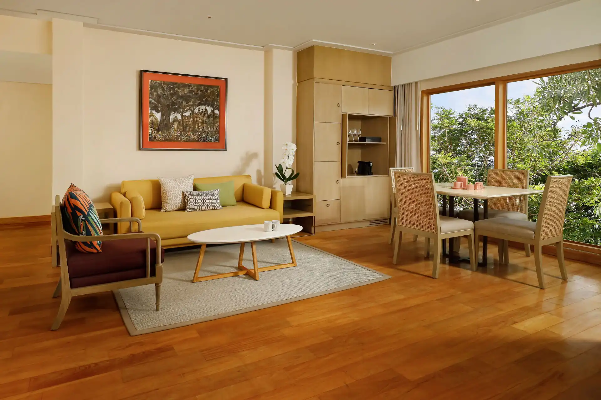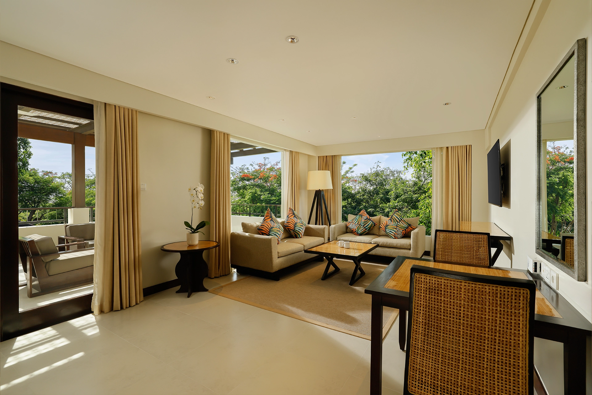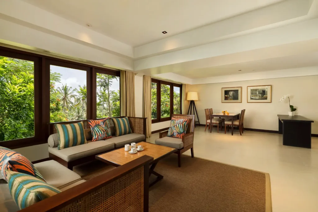 يقع جناح جونيور في موقع مميّز داخل الحدائق الغنية بالأعمال الفنية والعناصر المائية، ويشمل مزايا حصرية لصالة النادي (Club Lounge) ليمنح الضيوف تجربة إقامة راقية بكل تفاصيلها. يجمع الجناح بين الطابع الباليني التقليدي واللمسات العصرية بأسلوب أنيق يخلق إحساسًا بالراحة وكأنك في منزلك الثاني. يتميّز الجناح بتجهيزات مطوّرة تشمل آلة إسبريسو داخل الجناح، وحمّام فاخر مستوحى من أجواء السبا يضم دشًا منفصلًا وحوض استحمام، إضافة إلى منطقة معيشة أنيقة مع مساحة طعام وأريكة مريحة. ويتوفر للجناح شرفة أو تراس خاص يطل على الحدائق الهادئة، ليقدّم تجربة إقامة متكاملة تعبّر عن جوهر الأناقة البالينية المعاصرة.