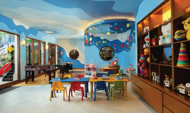 يوفّر الجناح العائلي تجربة إقامة استثنائية تجمع بين الفخامة والرحابة والراحة، حيث يتم تكوينه من ربط جناح ديلوكس مع شاليه جاردن كلوب ليقدّم مساحة واسعة تتجاوز 150 مترًا مربعًا، ما يجعله خيارًا مثاليًا للعائلات الباحثة عن الخصوصية والمساحة مع الاستفادة من إمكانية الدخول الحصري إلى صالة النادي (Club Lounge). يقع جناح الديلوكس في الطابق العلوي من شاليه أنيق بطابقين مستوحى من الطابع الباليني، ويضم غرفة نوم مستقلة مع حمّام داخلي فاخر بطابع سبا يشمل دشًا منفصلًا وحوض استحمام ومنطقة تبديل ملابس واسعة بنظام المشي. كما تحتوي مساحة المعيشة على طاولة طعام وأريكة مريحة ومساحة عمل، بينما تمتد شرفة كبيرة مجهّزة بطاولة وكراسٍ لتوفّر انتقالًا متناغمًا بين التصميم الداخلي العصري والحدائق الغنّاء.