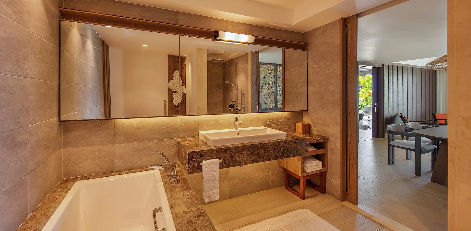 مثالي لمن يبحث عن ملاذ واسع على بعد خطوات من الشاطئ، حيث يوفر الجناح مساحات فسيحة مع إطلالات مباشرة على المحيط الهندي. يتميز بتصميم أنيق يزدان بقطع فنية وإكسسوارات مستوحاة من تقنيات النسج التقليدية في موريشيوس، ليعكس الثقافة النابضة والطبيعة الخلابة للجزيرة في جناح بغرفتي نوم.