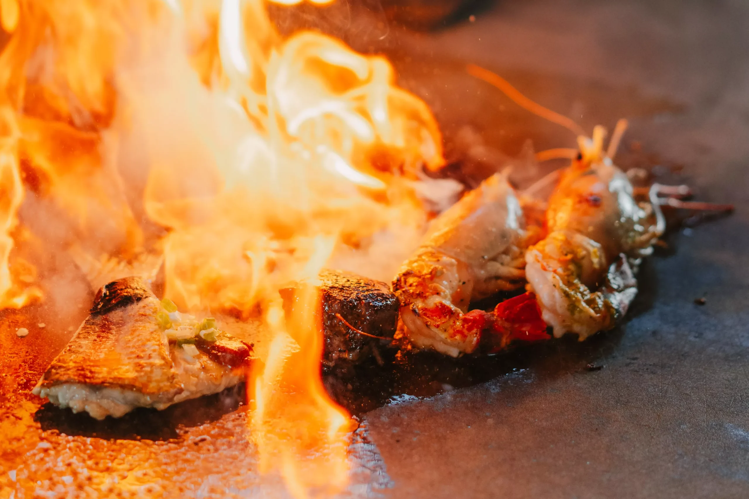 تجربة تفاعلية ممتعة حيث يطهو الشيف أمامك مباشرة اللحوم الطازجة، الأسماك والخضار.
