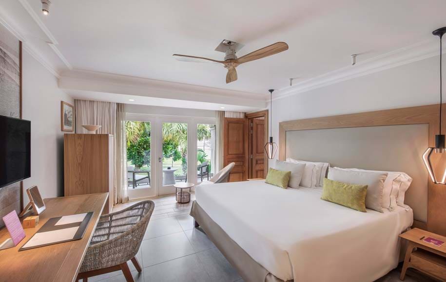 تضم غرفة نوم بسرير كينغ، وتتسع لإقامة حتى 3 بالغين أو لشخصين بالغين مع طفل أو مراهق. تقع الغرفة في الطابق الأول من فيلا على الطراز الكريولي، وتوفر إطلالة خلابة على المحيط والحدائق، مع شرفة خاصة وإمكانية وصول مباشر إلى الشاطئ. يحتوي الحمام على مقصورتين للتواليت والدش بشكل منفصل، بالإضافة إلى مغسلتين لراحة أكبر.