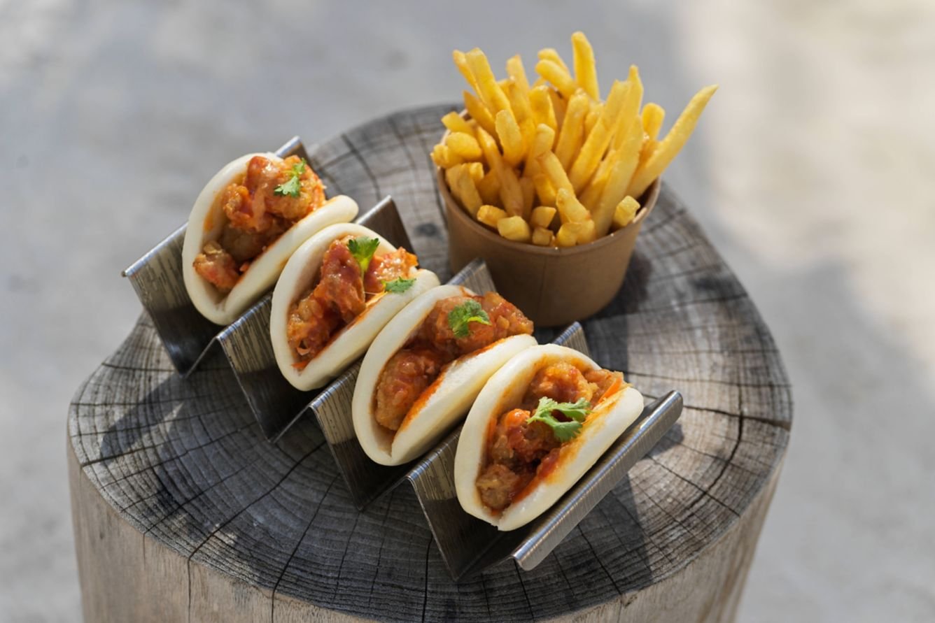 عربة طعام في قرية الموظفين تقدم أطباقاً آسيوية شهية مثل الديم سوم، الرامن، النودلز، وأطباق الشوارع من جنوب شرق آسيا في أجواء غير رسمية.
