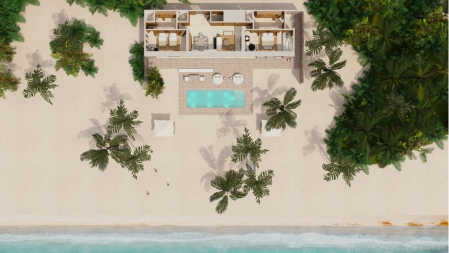 فيلا شاطئية فاخرة بمساحة 400 متر²، تحتوي على غرفتين نوم (غرفة رئيسية بسرير كينغ وغرفة ثانية بسريرين مزدوجين) وأريكة قابلة للتحويل، مع حوض سباحة خاص على الباحة (39 متر²) وجاكوزي داخل الغرفة. الفيلا توفر غرفة معيشة منفصلة، منطقة طعام واسعة، ومساحة خارجية للتمتع بإطلالات الشاطئ عند الغروب.