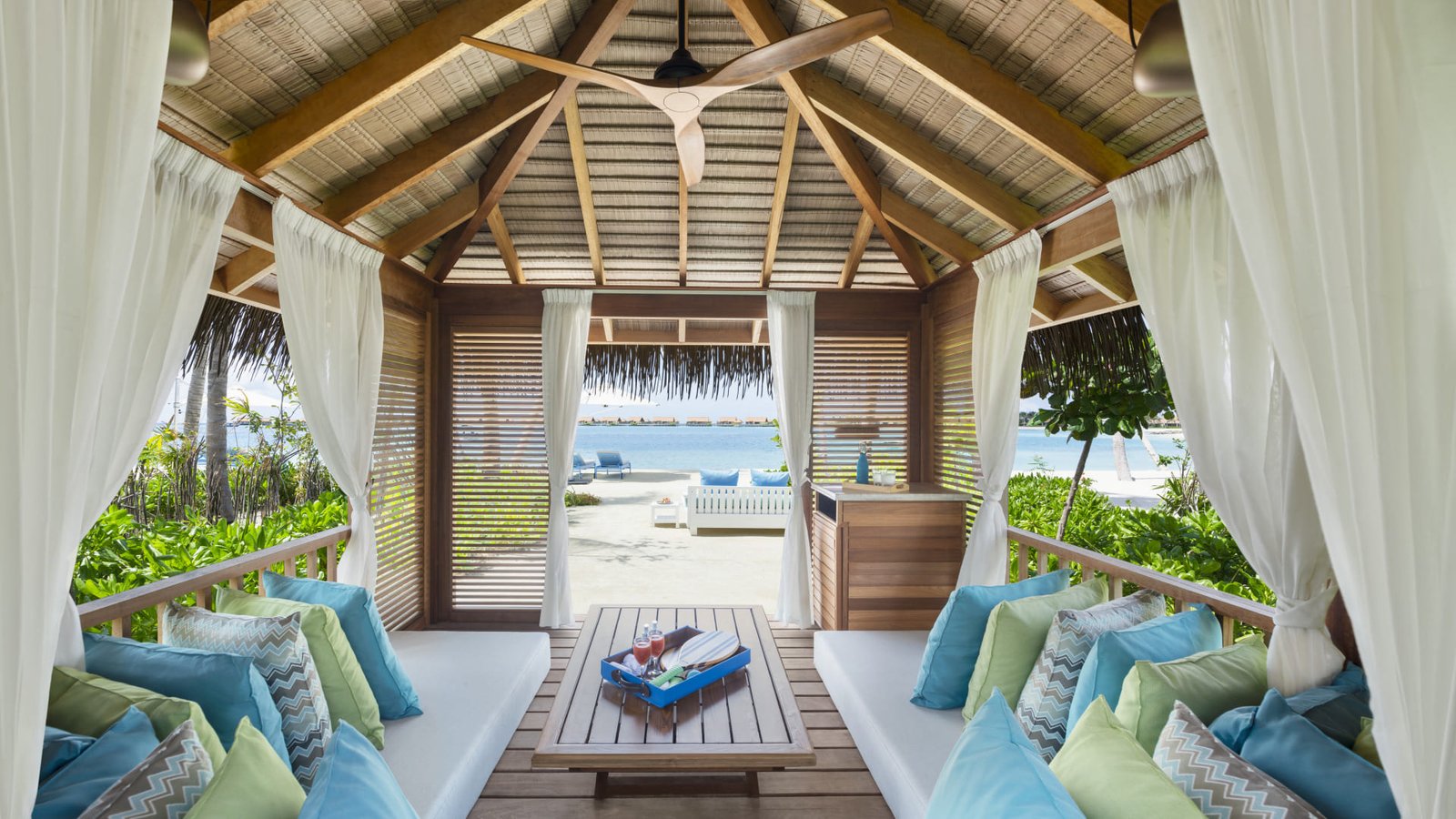 فيلا شاطئية بغرفتين نوم ومسبح خاص بمساحة 599 م²، تستوعب 4 بالغين وطفلين، مع مسبح لا متناهي، جاكوزي، كشك جلسات للأكل، وأسِرّة يومية مظللة، وإمكانية الوصول المباشر للشاطئ. الغرف مزودة بالخصوصية وجلسات خاصة، والصالة الداخلية واسعة مع أرائك كبيرة وطاولة طعام ونظام صوت وصورة حديث. النوافذ الممتدة من الأرض للسقف تطل على الحدائق الاستوائية، لتجربة مالديفية فاخرة، مع ملاحظة أن بعض إطلالات البحر قد تُحجب بسبب نمو الأشجار.
